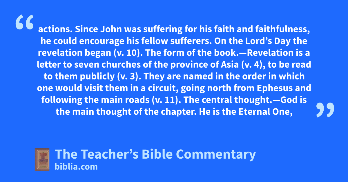 actions. Since John was suffering for his faith and faithfulness, he could encourage his fellow sufferers. On the Lord’s Day the revelation began (v. 10). The form of the book.—Revelation is a letter to seven churches of the province of Asia (v. 4), to be read to them publicly (v. 3). They are named in the order in which one would visit them in a circuit, going north from Ephesus and following the main roads (v. 11). The central thought.—God is the main thought of the chapter. He is the Eternal One,