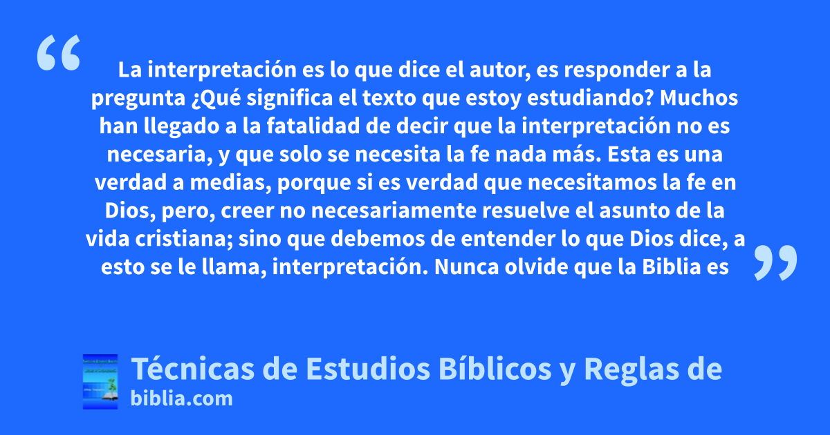 La interpretación es lo que dice el autor, es responder a la pregunta ¿Qué significa el texto que estoy estudiando? Muchos han llegado a la fatalidad de decir que la interpretación no es necesaria, y que solo se necesita la fe nada más. Esta es una verdad a medias, porque si es verdad que necesitamos la fe en Dios, pero, creer no necesariamente resuelve el asunto de la vida cristiana; sino que debemos de entender lo que Dios dice, a esto se le llama, interpretación. Nunca olvide que la Biblia es