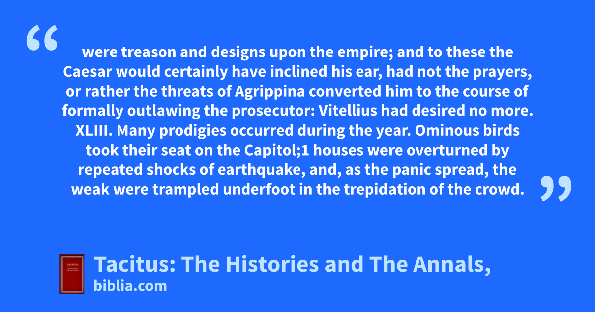 were treason and designs upon the empire; and to these the Caesar would certainly have inclined his ear, had not the prayers, or rather the threats of Agrippina converted him to the course of formally outlawing the prosecutor: Vitellius had desired no more. XLIII. Many prodigies occurred during the year. Ominous birds took their seat on the Capitol;1 houses were overturned by repeated shocks of earthquake, and, as the panic spread, the weak were trampled underfoot in the trepidation of the crowd.