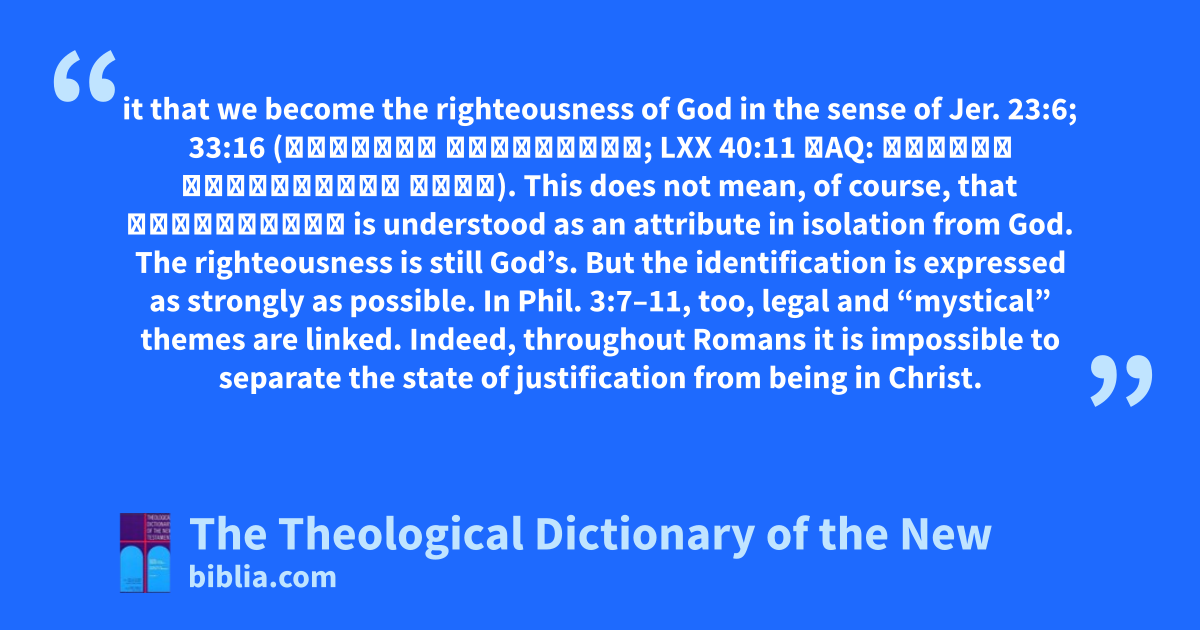 it that we become the righteousness of God in the sense of Jer. 23:6; 33:16 (יְהוָֹה צִדְקֵנוּ; LXX 40:11 אAQ: κύριος δικαιοσύνη ἡμῶν). This does not mean, of course, that δικαιοσύνη is understood as an attribute in isolation from God. The righteousness is still God’s. But the identification is expressed as strongly as possible. In Phil. 3:7–11, too, legal and “mystical” themes are linked. Indeed, throughout Romans it is impossible to separate the state of justification from being in Christ.