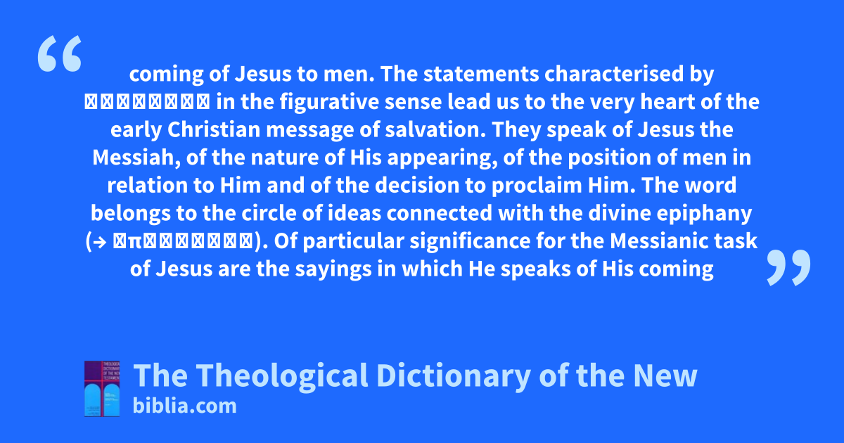 coming of Jesus to men. The statements characterised by ἔρχεσθαι in the figurative sense lead us to the very heart of the early Christian message of salvation. They speak of Jesus the Messiah, of the nature of His appearing, of the position of men in relation to Him and of the decision to proclaim Him. The word belongs to the circle of ideas connected with the divine epiphany (→ ἐπιφάνεια). Of particular significance for the Messianic task of Jesus are the sayings in which He speaks of His coming