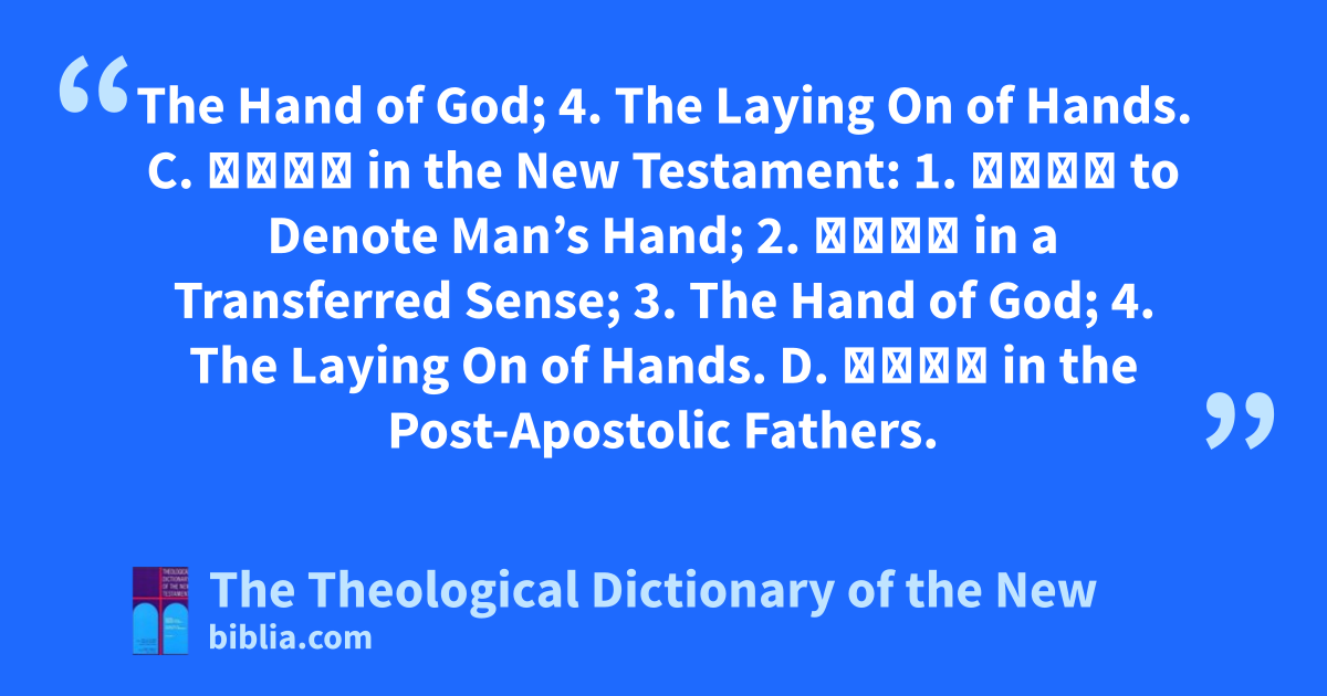 The Hand of God; 4. The Laying On of Hands. C. χείρ in the New Testament: 1. χείρ to Denote Man’s Hand; 2. χείρ in a Transferred Sense; 3. The Hand of God; 4. The Laying On of Hands. D. χείρ in the Post-Apostolic Fathers.