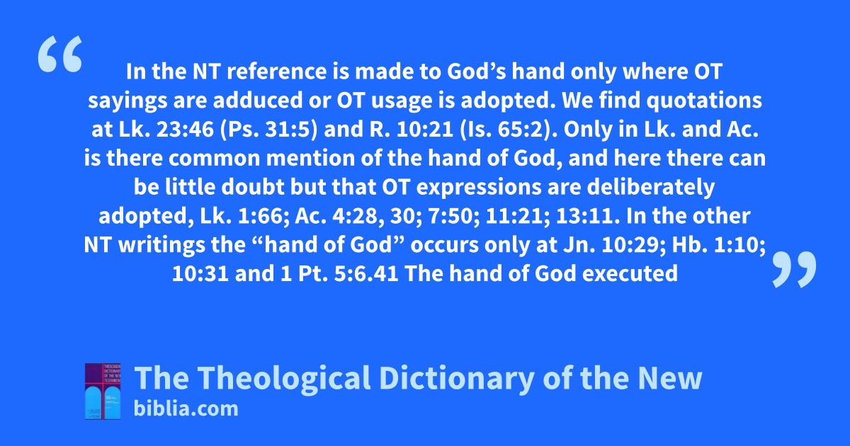 In the NT reference is made to God’s hand only where OT sayings are adduced or OT usage is adopted. We find quotations at Lk. 23:46 (Ps. 31:5) and R. 10:21 (Is. 65:2). Only in Lk. and Ac. is there common mention of the hand of God, and here there can be little doubt but that OT expressions are deliberately adopted, Lk. 1:66; Ac. 4:28, 30; 7:50; 11:21; 13:11. In the other NT writings the “hand of God” occurs only at Jn. 10:29; Hb. 1:10; 10:31 and 1 Pt. 5:6.41 The hand of God executed