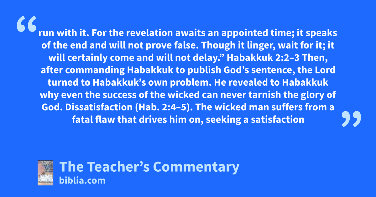 run with it. For the revelation awaits an appointed time; it speaks of the end and will not prove false. Though it linger, wait for it; it will certainly come and will not delay.” Habakkuk 2:2–3 Then, after commanding Habakkuk to publish God’s sentence, the Lord turned to Habakkuk’s own problem. He revealed to Habakkuk why even the success of the wicked can never tarnish the glory of God. Dissatisfaction (Hab. 2:4–5). The wicked man suffers from a fatal flaw that drives him on, seeking a satisfaction
