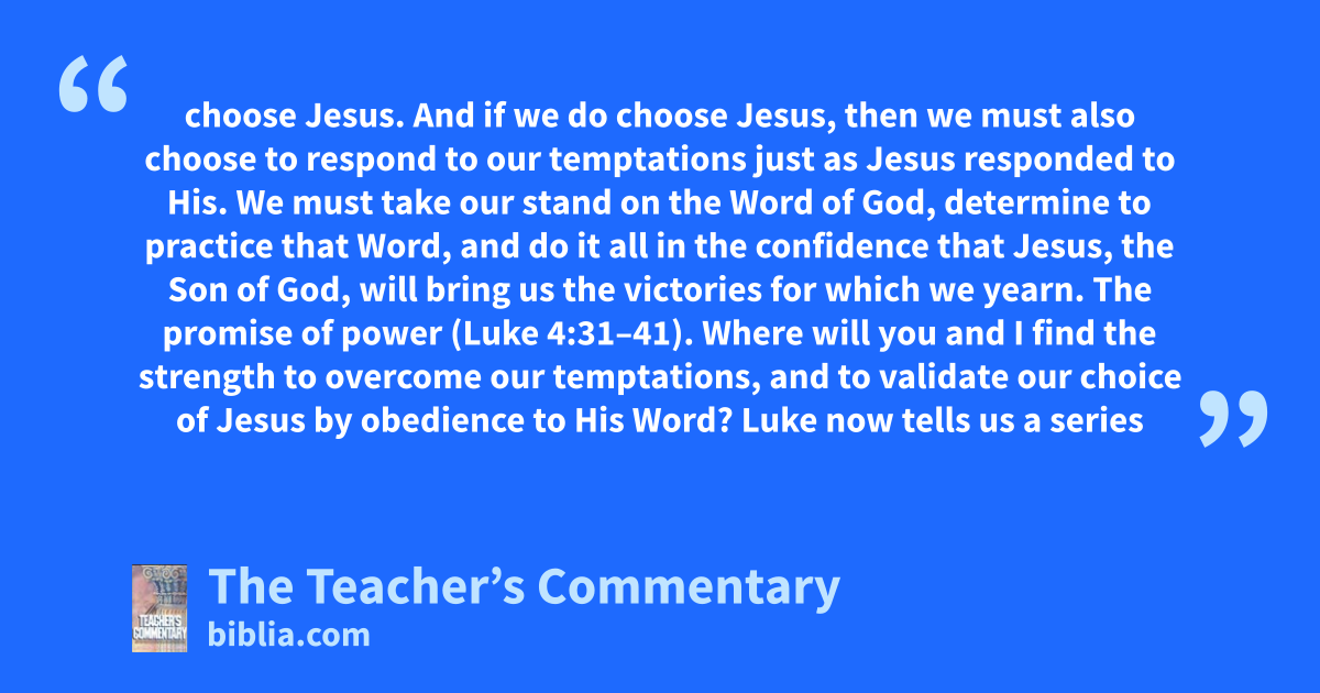 choose Jesus. And if we do choose Jesus, then we must also choose to respond to our temptations just as Jesus responded to His. We must take our stand on the Word of God, determine to practice that Word, and do it all in the confidence that Jesus, the Son of God, will bring us the victories for which we yearn. The promise of power (Luke 4:31–41). Where will you and I find the strength to overcome our temptations, and to validate our choice of Jesus by obedience to His Word? Luke now tells us a series