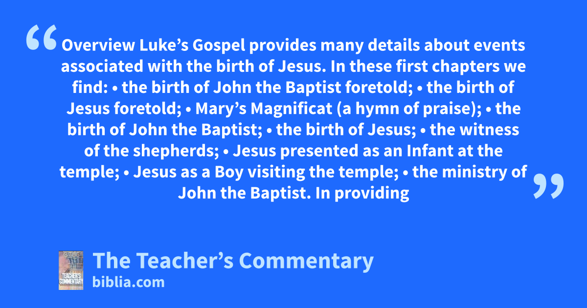 Overview Luke’s Gospel provides many details about events associated with the birth of Jesus. In these first chapters we find: • the birth of John the Baptist foretold; • the birth of Jesus foretold; • Mary’s Magnificat (a hymn of praise); • the birth of John the Baptist; • the birth of Jesus; • the witness of the shepherds; • Jesus presented as an Infant at the temple; • Jesus as a Boy visiting the temple; • the ministry of John the Baptist. In providing