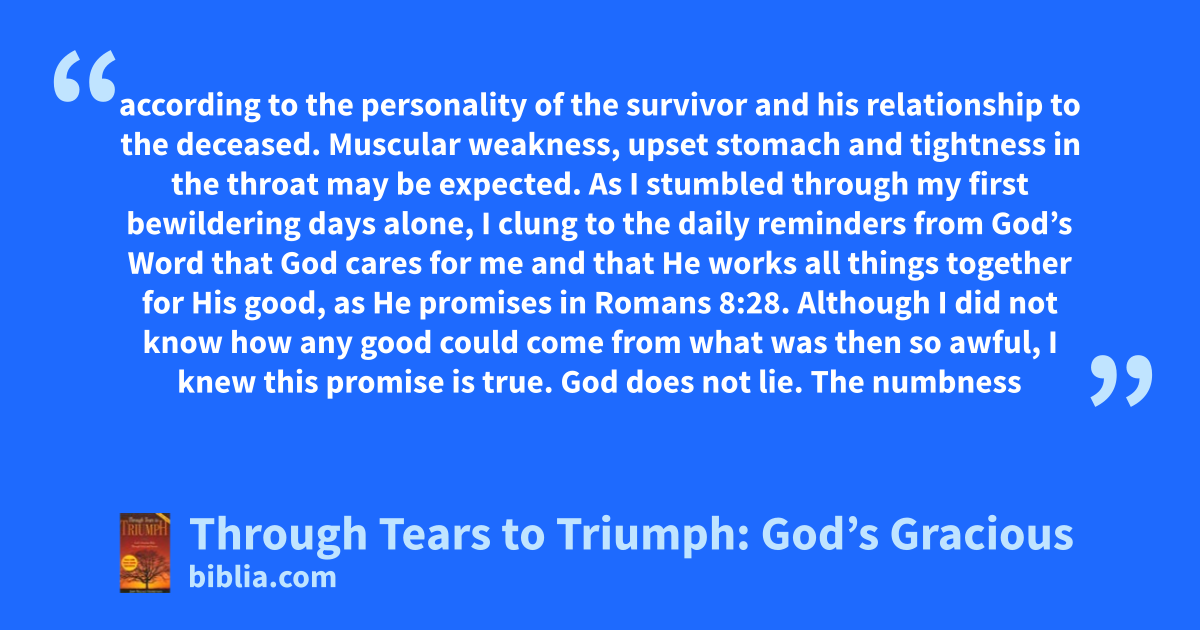 according to the personality of the survivor and his relationship to the deceased. Muscular weakness, upset stomach and tightness in the throat may be expected. As I stumbled through my first bewildering days alone, I clung to the daily reminders from God’s Word that God cares for me and that He works all things together for His good, as He promises in Romans 8:28. Although I did not know how any good could come from what was then so awful, I knew this promise is true. God does not lie. The numbness