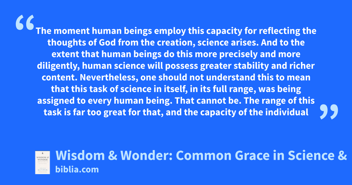The moment human beings employ this capacity for reflecting the thoughts of God from the creation, science arises. And to the extent that human beings do this more precisely and more diligently, human science will possess greater stability and richer content. Nevertheless, one should not understand this to mean that this task of science in itself, in its full range, was being assigned to every human being. That cannot be. The range of this task is far too great for that, and the capacity of the individual