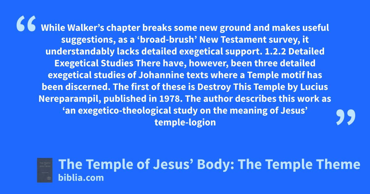 While Walker’s chapter breaks some new ground and makes useful suggestions, as a ‘broad-brush’ New Testament survey, it understandably lacks detailed exegetical support. 1.2.2 Detailed Exegetical Studies There have, however, been three detailed exegetical studies of Johannine texts where a Temple motif has been discerned. The first of these is Destroy This Temple by Lucius Nereparampil, published in 1978. The author describes this work as ‘an exegetico-theological study on the meaning of Jesus’ temple-logion