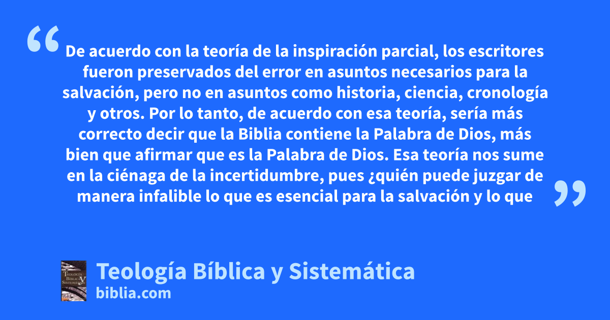 De acuerdo con la teoría de la inspiración parcial, los escritores fueron preservados del error en asuntos necesarios para la salvación, pero no en asuntos como historia, ciencia, cronología y otros. Por lo tanto, de acuerdo con esa teoría, sería más correcto decir que la Biblia contiene la Palabra de Dios, más bien que afirmar que es la Palabra de Dios. Esa teoría nos sume en la ciénaga de la incertidumbre, pues ¿quién puede juzgar de manera infalible lo que es esencial para la salvación y lo que
