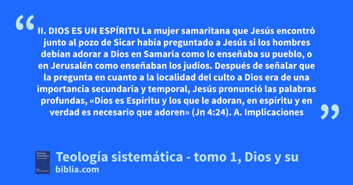 II. DIOS ES UN ESPÍRITU La mujer samaritana que Jesús encontró junto al pozo de Sicar había preguntado a Jesús si los hombres debían adorar a Dios en Samaria como lo enseñaba su pueblo, o en Jerusalén como enseñaban los judíos. Después de señalar que la pregunta en cuanto a la localidad del culto a Dios era de una importancia secundaria y temporal, Jesús pronunció las palabras profundas, «Dios es Espíritu y los que le adoran, en espíritu y en verdad es necesario que adoren» (Jn 4:24). A. Implicaciones