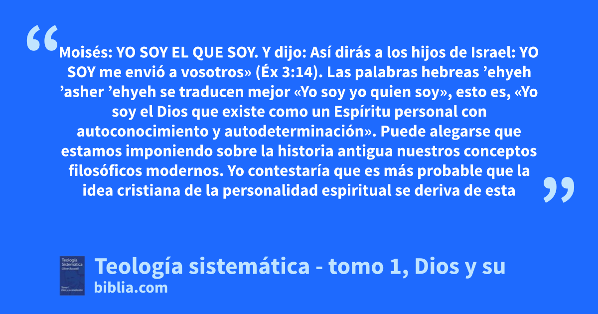 Moisés: YO SOY EL QUE SOY. Y dijo: Así dirás a los hijos de Israel: YO SOY me envió a vosotros» (Éx 3:14). Las palabras hebreas ’ehyeh ’asher ’ehyeh se traducen mejor «Yo soy yo quien soy», esto es, «Yo soy el Dios que existe como un Espíritu personal con autoconocimiento y autodeterminación». Puede alegarse que estamos imponiendo sobre la historia antigua nuestros conceptos filosóficos modernos. Yo contestaría que es más probable que la idea cristiana de la personalidad espiritual se deriva de esta