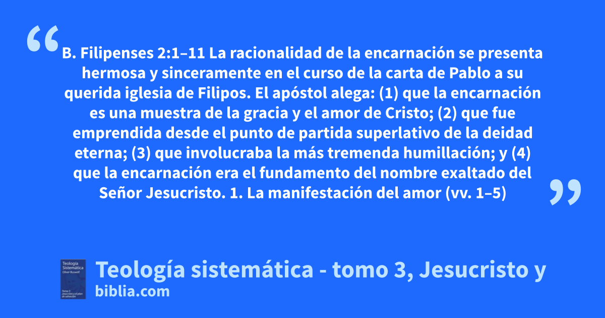 B. Filipenses 2:1–11 La racionalidad de la encarnación se presenta hermosa y sinceramente en el curso de la carta de Pablo a su querida iglesia de Filipos. El apóstol alega: (1) que la encarnación es una muestra de la gracia y el amor de Cristo; (2) que fue emprendida desde el punto de partida superlativo de la deidad eterna; (3) que involucraba la más tremenda humillación; y (4) que la encarnación era el fundamento del nombre exaltado del Señor Jesucristo. 1. La manifestación del amor (vv. 1–5)