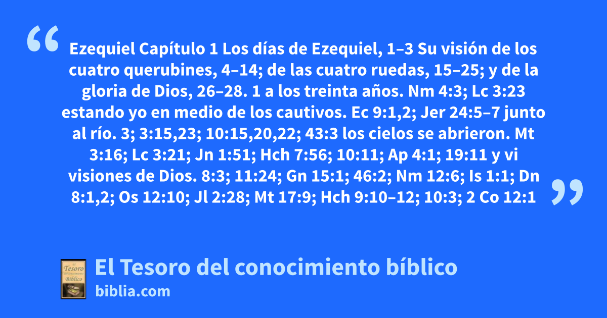 1 a los treinta años. Nm 4:3; Lc 3:23 estando yo en medio de los cautivos. Ec 9:1,2; Jer 24:5–7 junto al río. 3; 3:15,23; 10:15,20,22; 43:3 los cielos se abrieron. Mt 3:16; Lc 3:21; Jn 1:51; Hch 7:56; 10:11; Ap 4:1; 19:11 y vi visiones de Dios. 8:3; 11:24; Gn 15:1; 46:2; Nm 12:6; Is 1:1; Dn 8:1,2; Os 12:10; Jl 2:28; Mt 17:9; Hch 9:10–12; 10:3; 2 Co 12:1