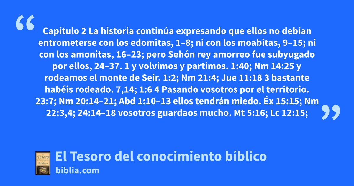 La historia continúa expresando que ellos no debían entrometerse con los edomitas, 1–8; ni con los moabitas, 9–15; ni con los amonitas, 16–23; pero Sehón rey amorreo fue subyugado por ellos, 24–37.