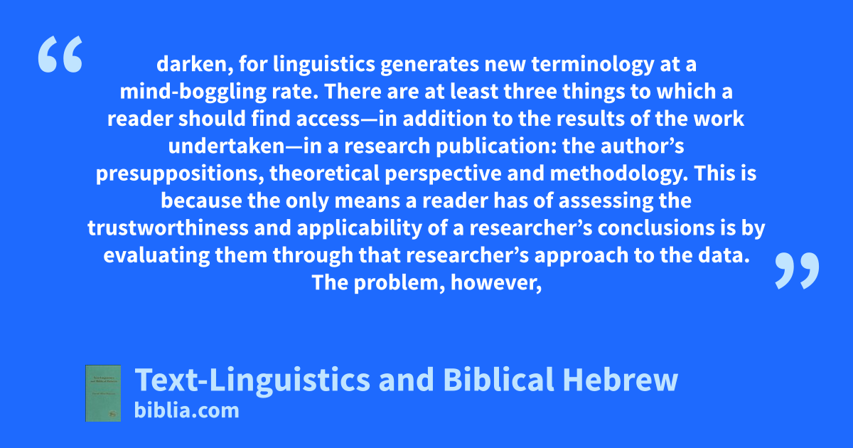 darken, for linguistics generates new terminology at a mind-boggling rate. There are at least three things to which a reader should find access—in addition to the results of the work undertaken—in a research publication: the author’s presuppositions, theoretical perspective and methodology. This is because the only means a reader has of assessing the trustworthiness and applicability of a researcher’s conclusions is by evaluating them through that researcher’s approach to the data. The problem, however,