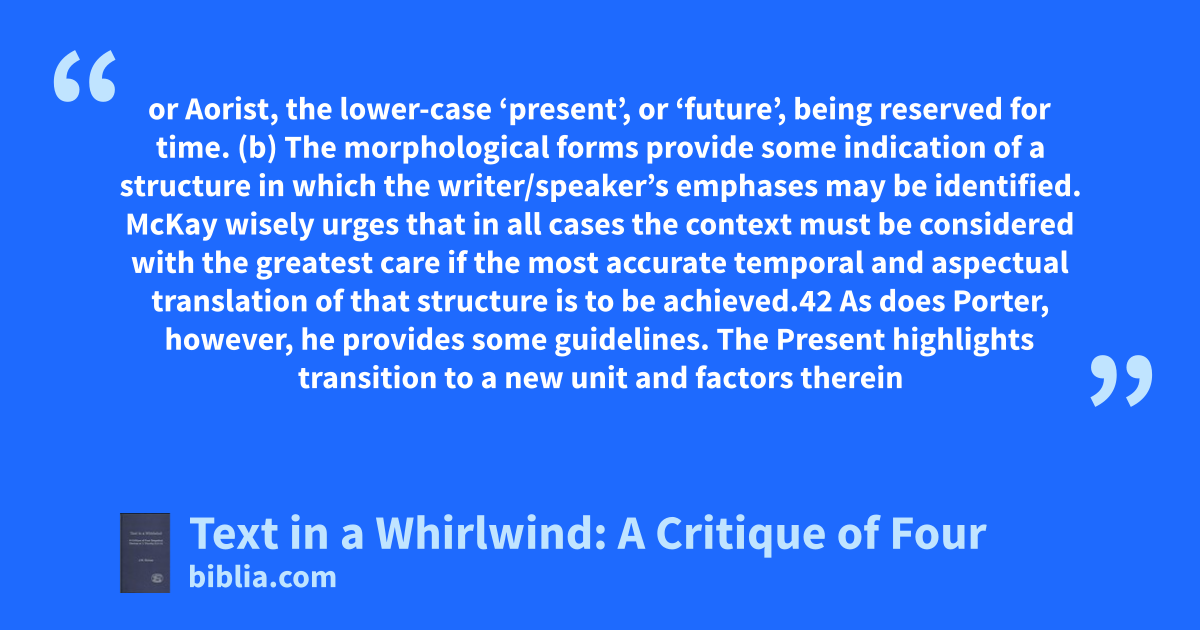 or Aorist, the lower-case ‘present’, or ‘future’, being reserved for time. (b) The morphological forms provide some indication of a structure in which the writer/speaker’s emphases may be identified. McKay wisely urges that in all cases the context must be considered with the greatest care if the most accurate temporal and aspectual translation of that structure is to be achieved.42 As does Porter, however, he provides some guidelines. The Present highlights transition to a new unit and factors therein