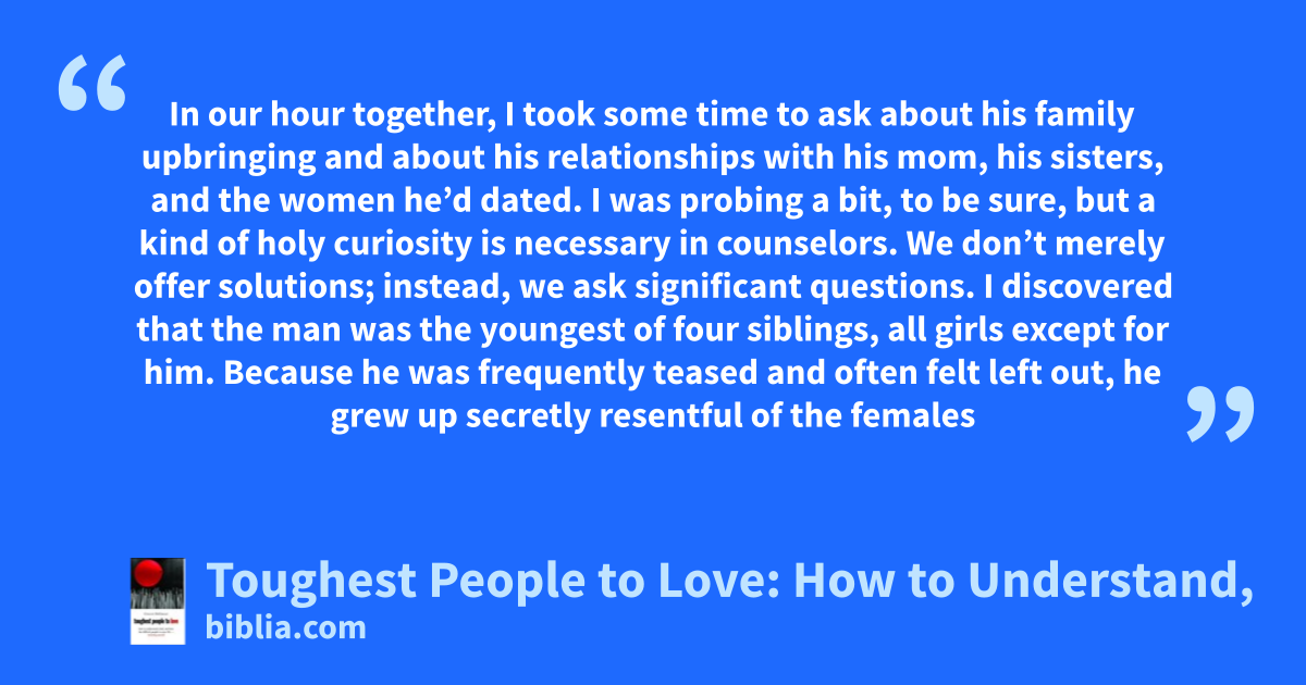 In our hour together, I took some time to ask about his family upbringing and about his relationships with his mom, his sisters, and the women he’d dated. I was probing a bit, to be sure, but a kind of holy curiosity is necessary in counselors. We don’t merely offer solutions; instead, we ask significant questions. I discovered that the man was the youngest of four siblings, all girls except for him. Because he was frequently teased and often felt left out, he grew up secretly resentful of the females
