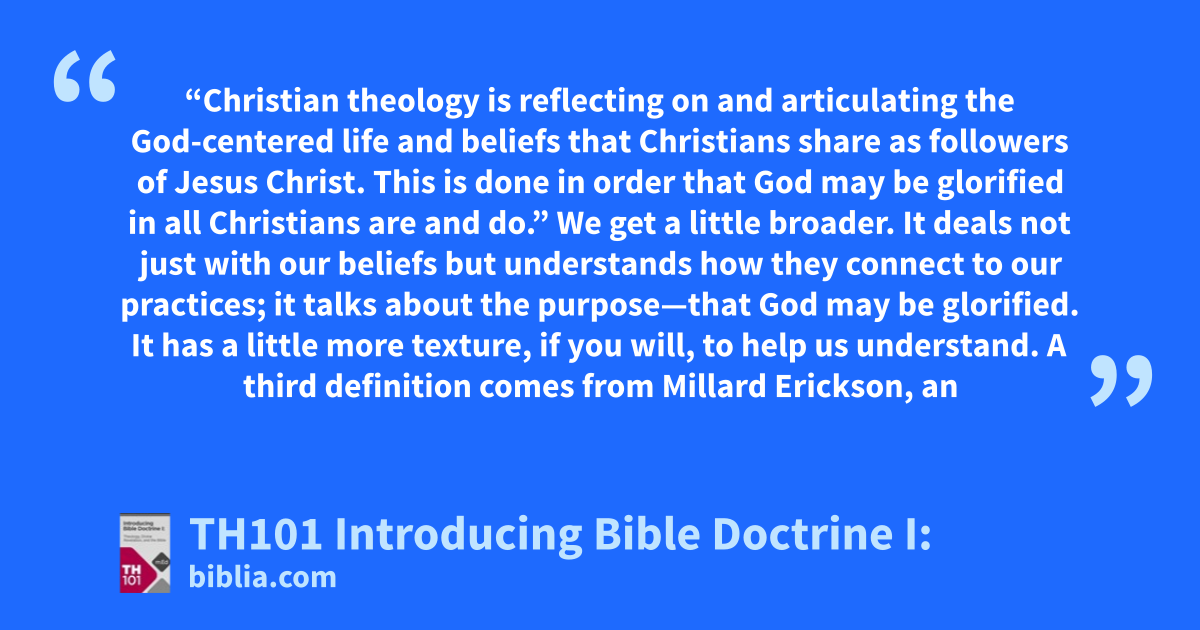 “Christian theology is reflecting on and articulating the God-centered life and beliefs that Christians share as followers of Jesus Christ. This is done in order that God may be glorified in all Christians are and do.” We get a little broader. It deals not just with our beliefs but understands how they connect to our practices; it talks about the purpose—that God may be glorified. It has a little more texture, if you will, to help us understand. A third definition comes from Millard Erickson, an