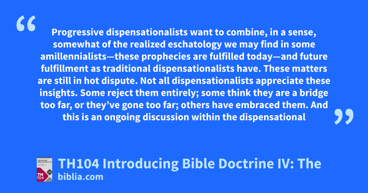 Progressive dispensationalists want to combine, in a sense, somewhat of the realized eschatology we may find in some amillennialists—these prophecies are fulfilled today—and future fulfillment as traditional dispensationalists have. These matters are still in hot dispute. Not all dispensationalists appreciate these insights. Some reject them entirely; some think they are a bridge too far, or they’ve gone too far; others have embraced them. And this is an ongoing discussion within the dispensational
