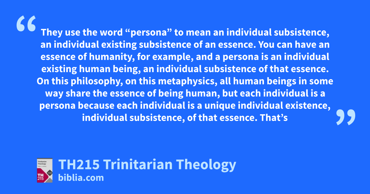 They use the word “persona” to mean an individual subsistence, an individual existing subsistence of an essence. You can have an essence of humanity, for example, and a persona is an individual existing human being, an individual subsistence of that essence. On this philosophy, on this metaphysics, all human beings in some way share the essence of being human, but each individual is a persona because each individual is a unique individual existence, individual subsistence, of that essence. That’s