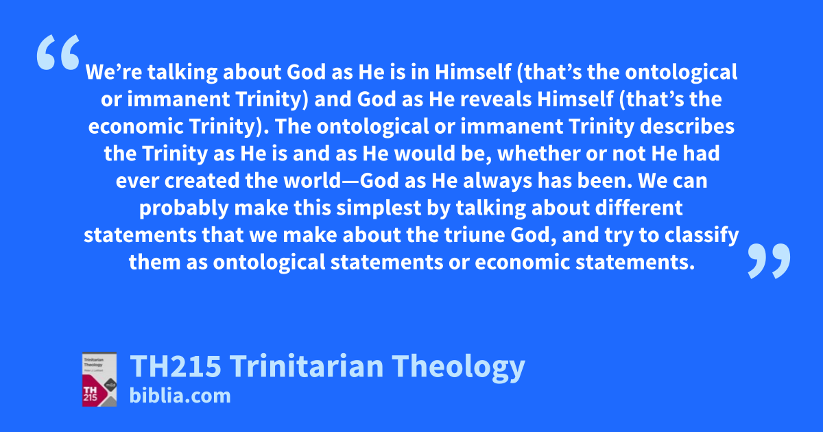 We’re talking about God as He is in Himself (that’s the ontological or immanent Trinity) and God as He reveals Himself (that’s the economic Trinity). The ontological or immanent Trinity describes the Trinity as He is and as He would be, whether or not He had ever created the world—God as He always has been. We can probably make this simplest by talking about different statements that we make about the triune God, and try to classify them as ontological statements or economic statements.