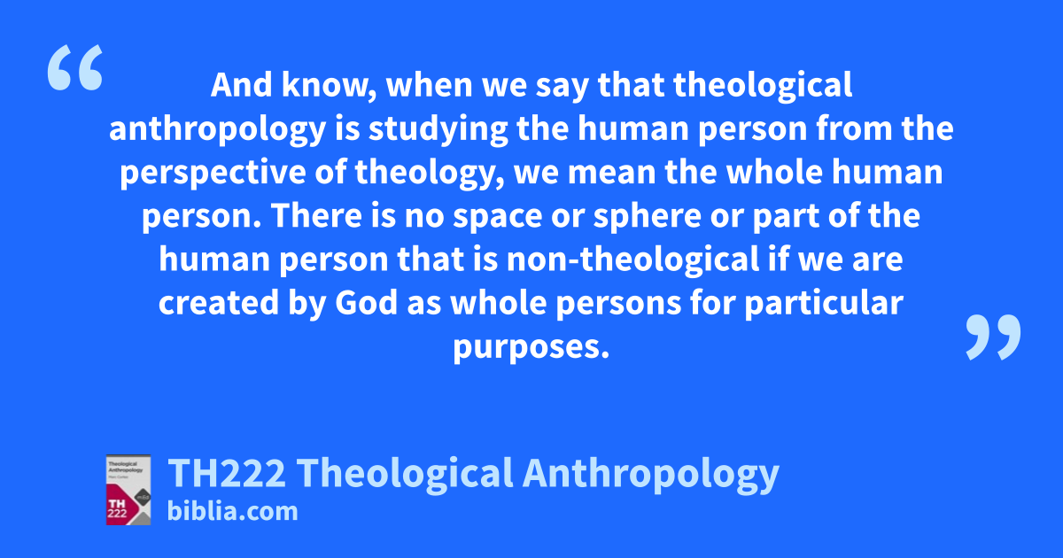 And know, when we say that theological anthropology is studying the human person from the perspective of theology, we mean the whole human person. There is no space or sphere or part of the human person that is non-theological if we are created by God as whole persons for particular purposes.