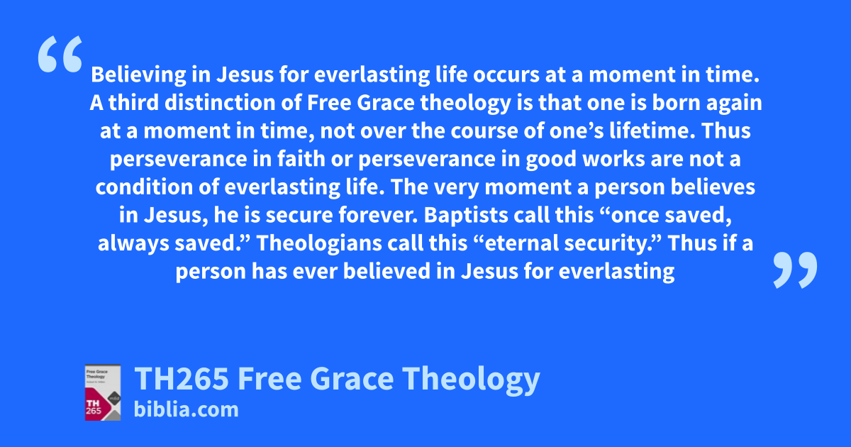 Believing in Jesus for everlasting life occurs at a moment in time. A third distinction of Free Grace theology is that one is born again at a moment in time, not over the course of one’s lifetime. Thus perseverance in faith or perseverance in good works are not a condition of everlasting life. The very moment a person believes in Jesus, he is secure forever. Baptists call this “once saved, always saved.” Theologians call this “eternal security.” Thus if a person has ever believed in Jesus for everlasting