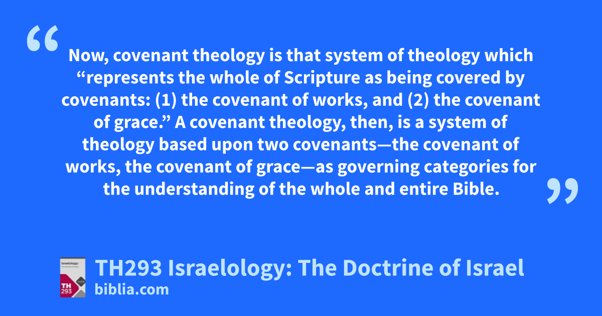 Now, covenant theology is that system of theology which “represents the whole of Scripture as being covered by covenants: (1) the covenant of works, and (2) the covenant of grace.” A covenant theology, then, is a system of theology based upon two covenants—the covenant of works, the covenant of grace—as governing categories for the understanding of the whole and entire Bible.