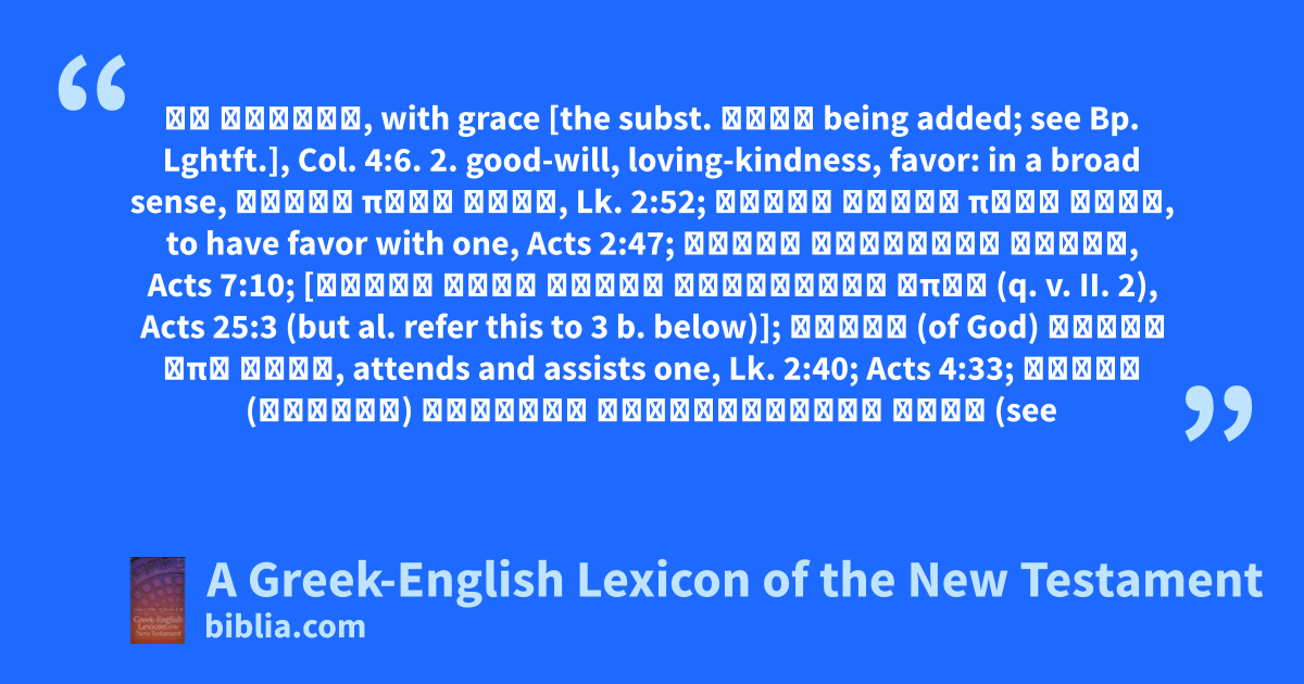 ἐν χάριτι, with grace [the subst. ἅλας being added; see Bp. Lghtft.], Col. 4:6. 2. good-will, loving-kindness, favor: in a broad sense, χάρις παρά τινι, Lk. 2:52; ἔχειν χάριν πρός τινα, to have favor with one, Acts 2:47; χάρις ἐναντίον τινός, Acts 7:10; [χάριν κατά τινος αἰτεῖσθαι ὅπως (q. v. II. 2), Acts 25:3 (but al. refer this to 3 b. below)]; χάρις (of God) ἐατὶν ἐπί τινα, attends and assists one, Lk. 2:40; Acts 4:33; χάριν (χάριτα) χάριτας κατατίθεσθαί τινι (see