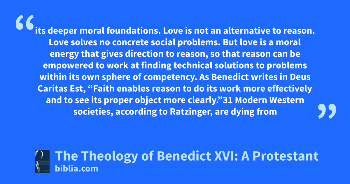 its deeper moral foundations. Love is not an alternative to reason. Love solves no concrete social problems. But love is a moral energy that gives direction to reason, so that reason can be empowered to work at finding technical solutions to problems within its own sphere of competency. As Benedict writes in Deus Caritas Est, “Faith enables reason to do its work more effectively and to see its proper object more clearly.”31 Modern Western societies, according to Ratzinger, are dying from