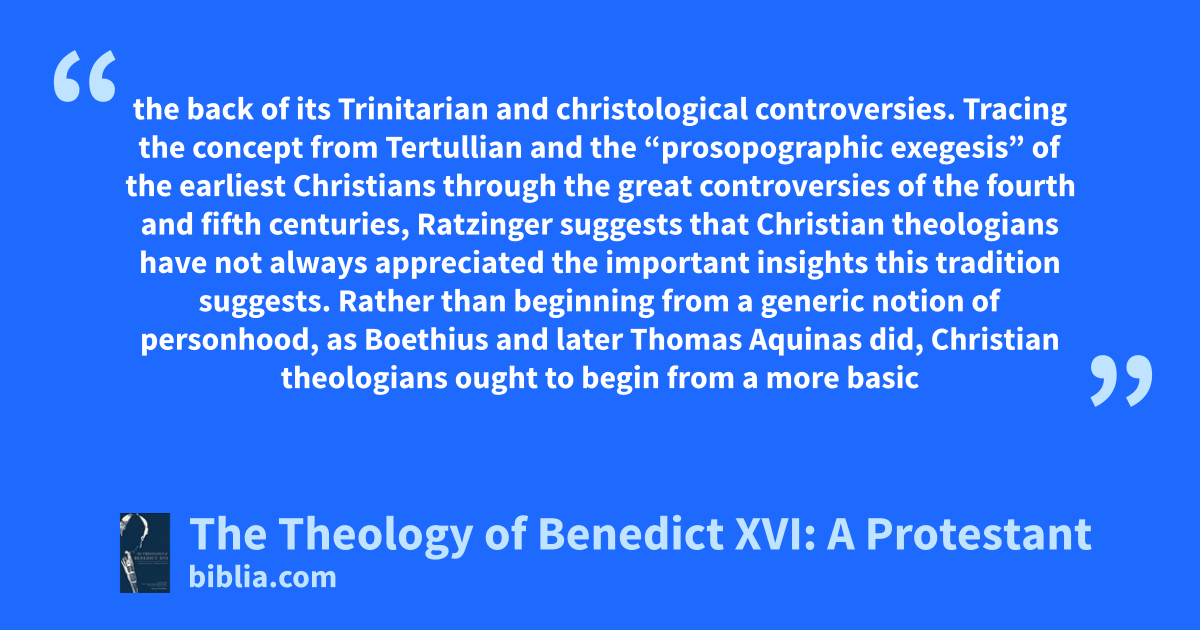 the back of its Trinitarian and christological controversies. Tracing the concept from Tertullian and the “prosopographic exegesis” of the earliest Christians through the great controversies of the fourth and fifth centuries, Ratzinger suggests that Christian theologians have not always appreciated the important insights this tradition suggests. Rather than beginning from a generic notion of personhood, as Boethius and later Thomas Aquinas did, Christian theologians ought to begin from a more basic