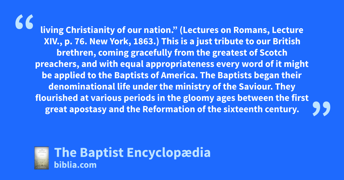 living Christianity of our nation.” (Lectures on Romans, Lecture XIV., p. 76. New York, 1863.) This is a just tribute to our British brethren, coming gracefully from the greatest of Scotch preachers, and with equal appropriateness every word of it might be applied to the Baptists of America. The Baptists began their denominational life under the ministry of the Saviour. They flourished at various periods in the gloomy ages between the first great apostasy and the Reformation of the sixteenth century.