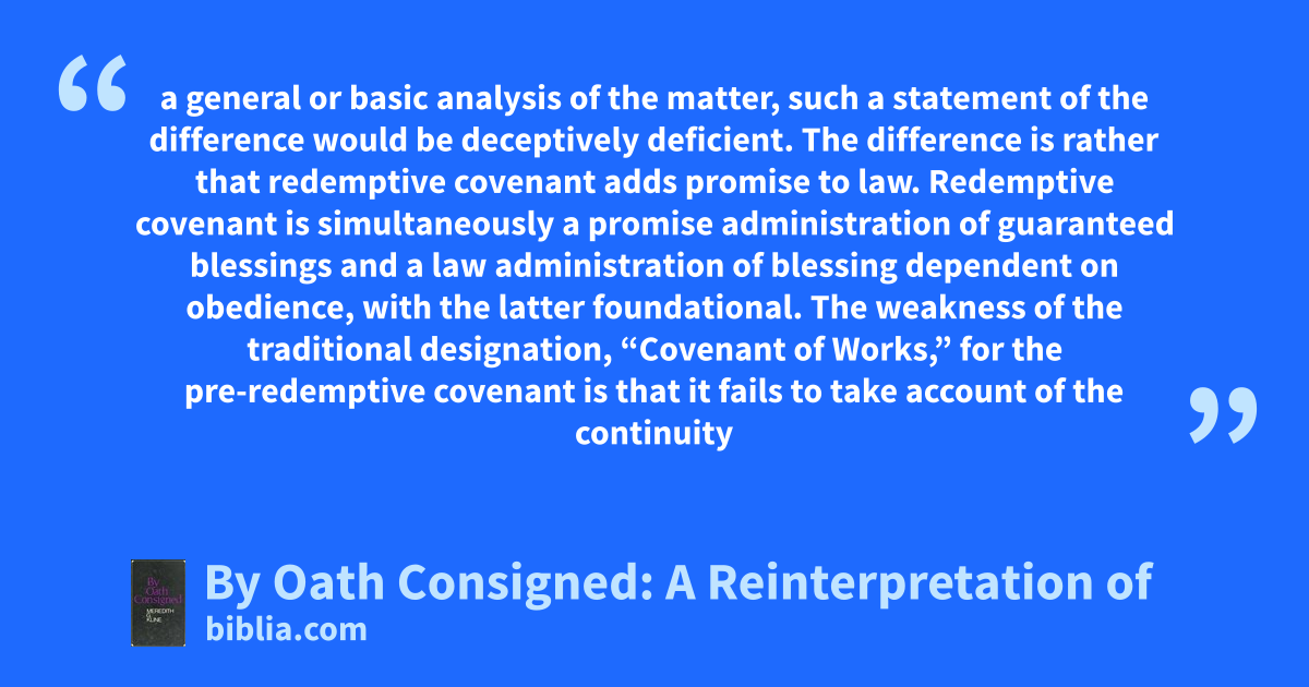 a general or basic analysis of the matter, such a statement of the difference would be deceptively deficient. The difference is rather that redemptive covenant adds promise to law. Redemptive covenant is simultaneously a promise administration of guaranteed blessings and a law administration of blessing dependent on obedience, with the latter foundational. The weakness of the traditional designation, “Covenant of Works,” for the pre-redemptive covenant is that it fails to take account of the continuity
