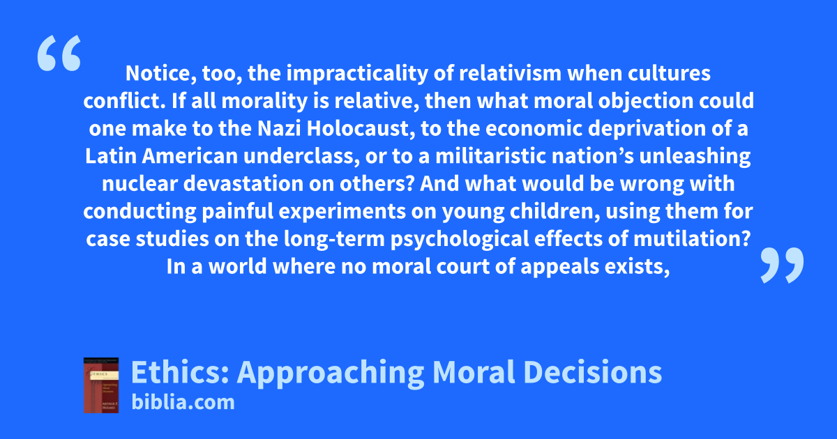 Notice, too, the impracticality of relativism when cultures conflict. If all morality is relative, then what moral objection could one make to the Nazi Holocaust, to the economic deprivation of a Latin American underclass, or to a militaristic nation’s unleashing nuclear devastation on others? And what would be wrong with conducting painful experiments on young children, using them for case studies on the long-term psychological effects of mutilation? In a world where no moral court of appeals exists,