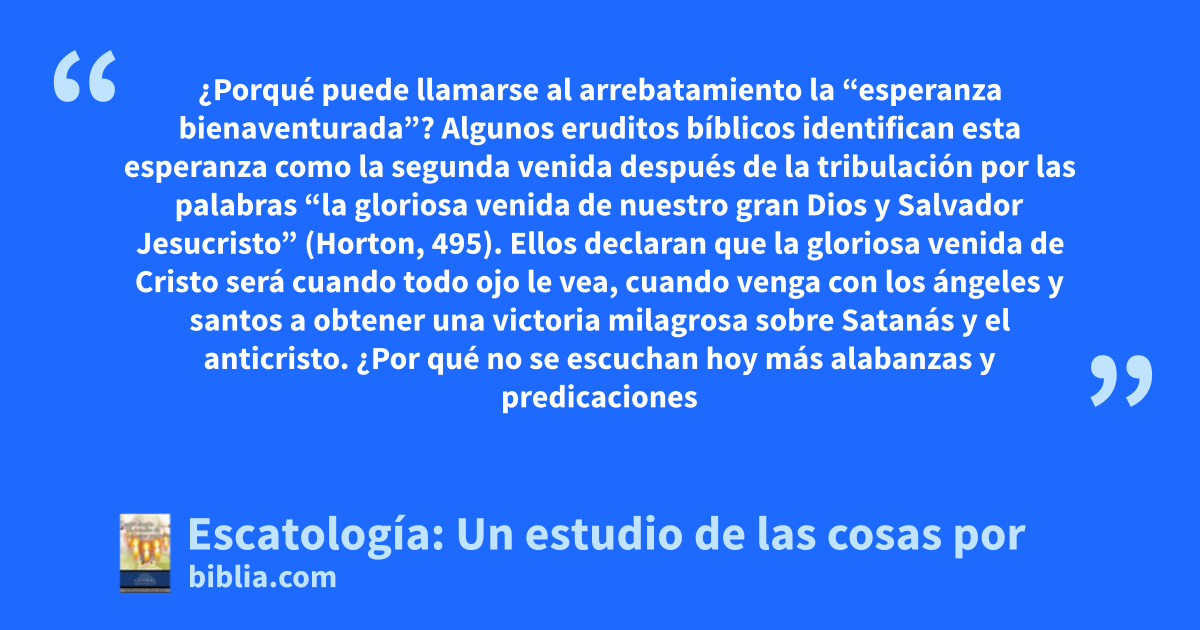 ¿Porqué puede llamarse al arrebatamiento la “esperanza bienaventurada”? Algunos eruditos bíblicos identifican esta esperanza como la segunda venida después de la tribulación por las palabras “la gloriosa venida de nuestro gran Dios y Salvador Jesucristo” (Horton, 495). Ellos declaran que la gloriosa venida de Cristo será cuando todo ojo le vea, cuando venga con los ángeles y santos a obtener una victoria milagrosa sobre Satanás y el anticristo. ¿Por qué no se escuchan hoy más alabanzas y predicaciones