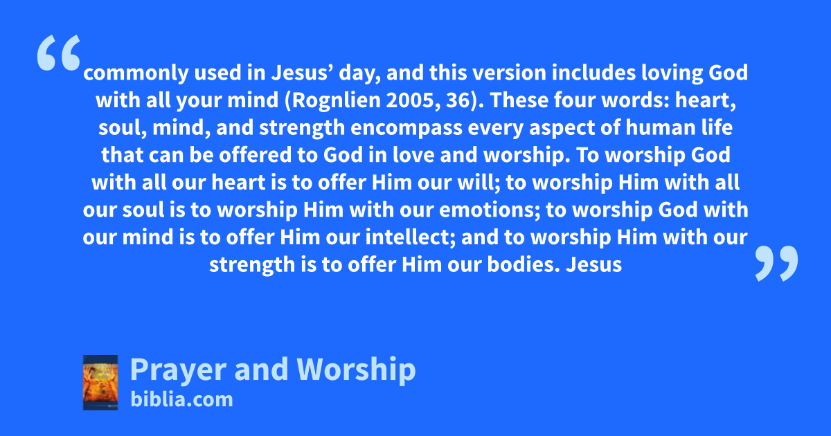 commonly used in Jesus’ day, and this version includes loving God with all your mind (Rognlien 2005, 36). These four words: heart, soul, mind, and strength encompass every aspect of human life that can be offered to God in love and worship. To worship God with all our heart is to offer Him our will; to worship Him with all our soul is to worship Him with our emotions; to worship God with our mind is to offer Him our intellect; and to worship Him with our strength is to offer Him our bodies. Jesus