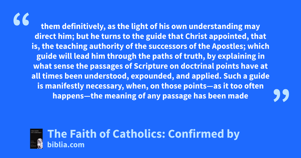 them definitively, as the light of his own understanding may direct him; but he turns to the guide that Christ appointed, that is, the teaching authority of the successors of the Apostles; which guide will lead him through the paths of truth, by explaining in what sense the passages of Scripture on doctrinal points have at all times been understood, expounded, and applied. Such a guide is manifestly necessary, when, on those points—as it too often happens—the meaning of any passage has been made