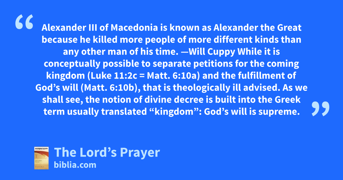 Alexander III of Macedonia is known as Alexander the Great because he killed more people of more different kinds than any other man of his time. —Will Cuppy While it is conceptually possible to separate petitions for the coming kingdom (Luke 11:2c = Matt. 6:10a) and the fulfillment of God’s will (Matt. 6:10b), that is theologically ill advised. As we shall see, the notion of divine decree is built into the Greek term usually translated “kingdom”: God’s will is supreme.
