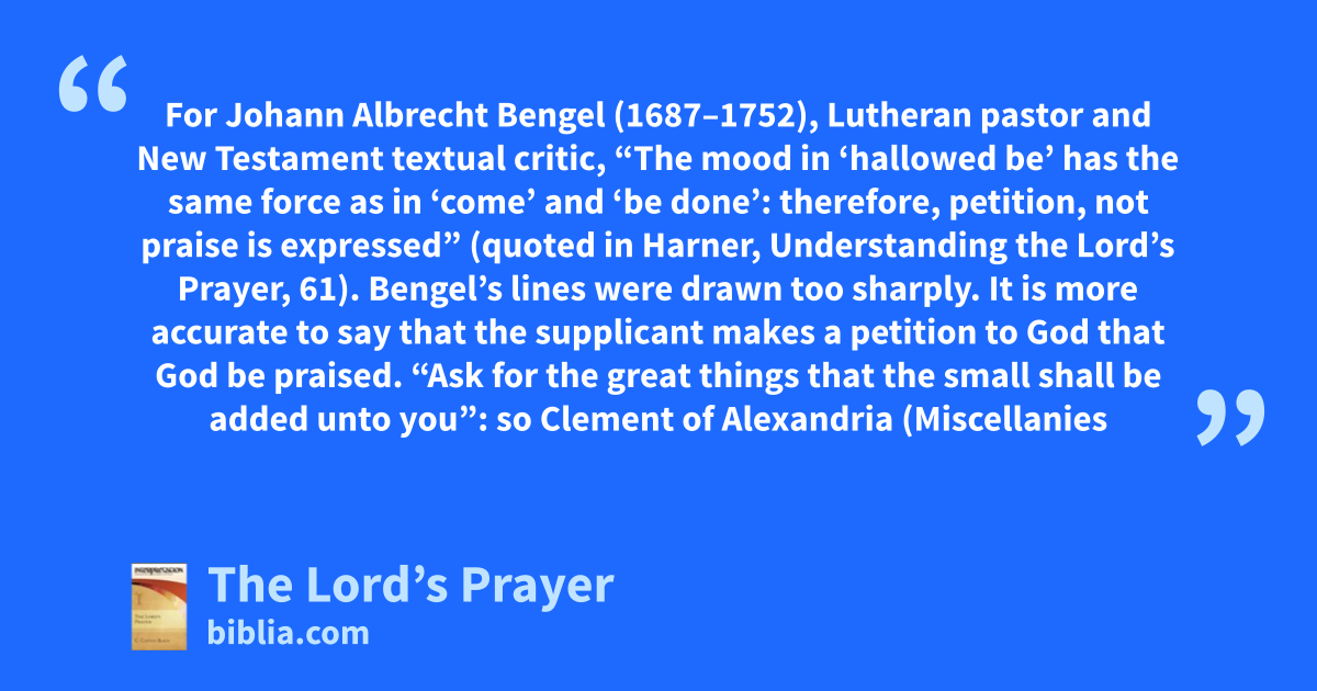 For Johann Albrecht Bengel (1687–1752), Lutheran pastor and New Testament textual critic, “The mood in ‘hallowed be’ has the same force as in ‘come’ and ‘be done’: therefore, petition, not praise is expressed” (quoted in Harner, Understanding the Lord’s Prayer, 61). Bengel’s lines were drawn too sharply. It is more accurate to say that the supplicant makes a petition to God that God be praised. “Ask for the great things that the small shall be added unto you”: so Clement of Alexandria (Miscellanies