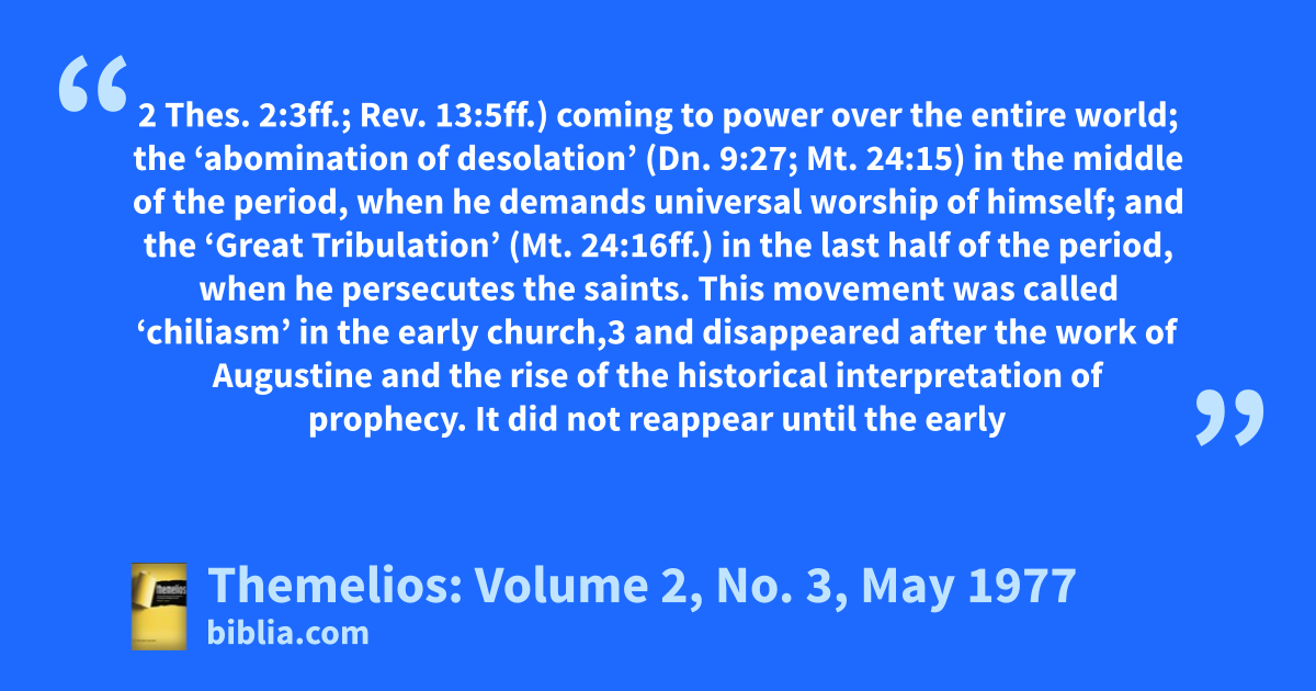 2 Thes. 2:3ff.; Rev. 13:5ff.) coming to power over the entire world; the ‘abomination of desolation’ (Dn. 9:27; Mt. 24:15) in the middle of the period, when he demands universal worship of himself; and the ‘Great Tribulation’ (Mt. 24:16ff.) in the last half of the period, when he persecutes the saints. This movement was called ‘chiliasm’ in the early church,3 and disappeared after the work of Augustine and the rise of the historical interpretation of prophecy. It did not reappear until the early