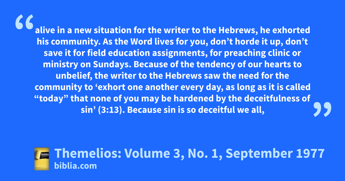 alive in a new situation for the writer to the Hebrews, he exhorted his community. As the Word lives for you, don’t horde it up, don’t save it for field education assignments, for preaching clinic or ministry on Sundays. Because of the tendency of our hearts to unbelief, the writer to the Hebrews saw the need for the community to ‘exhort one another every day, as long as it is called “today” that none of you may be hardened by the deceitfulness of sin’ (3:13). Because sin is so deceitful we all,