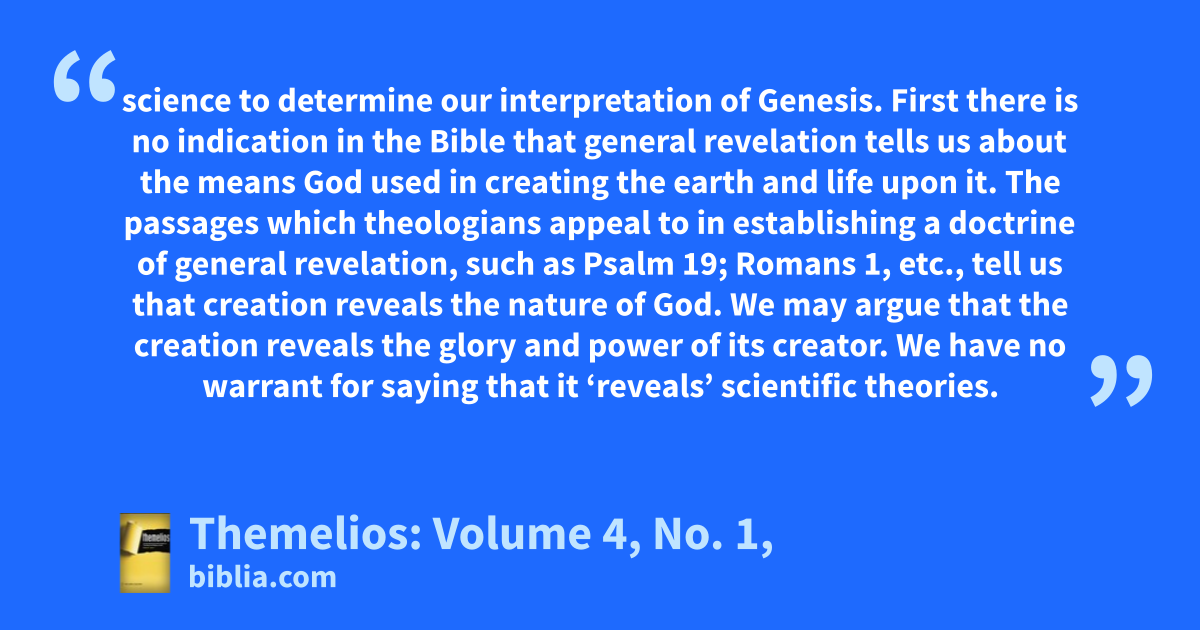 science to determine our interpretation of Genesis. First there is no indication in the Bible that general revelation tells us about the means God used in creating the earth and life upon it. The passages which theologians appeal to in establishing a doctrine of general revelation, such as Psalm 19; Romans 1, etc., tell us that creation reveals the nature of God. We may argue that the creation reveals the glory and power of its creator. We have no warrant for saying that it ‘reveals’ scientific theories.