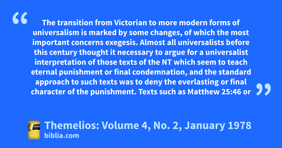 The transition from Victorian to more modern forms of universalism is marked by some changes, of which the most important concerns exegesis. Almost all universalists before this century thought it necessary to argue for a universalist interpretation of those texts of the NT which seem to teach eternal punishment or final condemnation, and the standard approach to such texts was to deny the everlasting or final character of the punishment. Texts such as Matthew 25:46 or