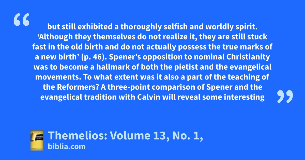 but still exhibited a thoroughly selfish and worldly spirit. ‘Although they themselves do not realize it, they are still stuck fast in the old birth and do not actually possess the true marks of a new birth’ (p. 46). Spener’s opposition to nominal Christianity was to become a hallmark of both the pietist and the evangelical movements. To what extent was it also a part of the teaching of the Reformers? A three-point comparison of Spener and the evangelical tradition with Calvin will reveal some interesting
