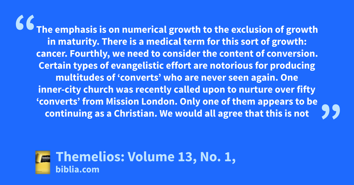 The emphasis is on numerical growth to the exclusion of growth in maturity. There is a medical term for this sort of growth: cancer. Fourthly, we need to consider the content of conversion. Certain types of evangelistic effort are notorious for producing multitudes of ‘converts’ who are never seen again. One inner-city church was recently called upon to nurture over fifty ‘converts’ from Mission London. Only one of them appears to be continuing as a Christian. We would all agree that this is not