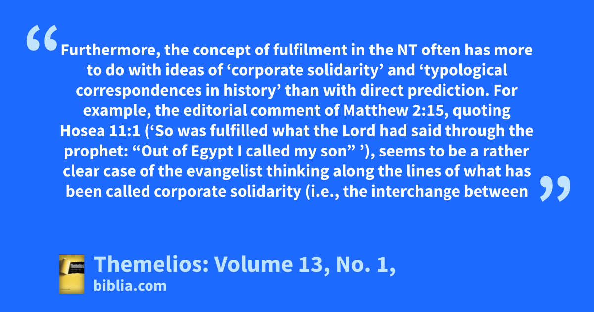 Furthermore, the concept of fulfilment in the NT often has more to do with ideas of ‘corporate solidarity’ and ‘typological correspondences in history’ than with direct prediction. For example, the editorial comment of Matthew 2:15, quoting Hosea 11:1 (‘So was fulfilled what the Lord had said through the prophet: “Out of Egypt I called my son” ’), seems to be a rather clear case of the evangelist thinking along the lines of what has been called corporate solidarity (i.e., the interchange between