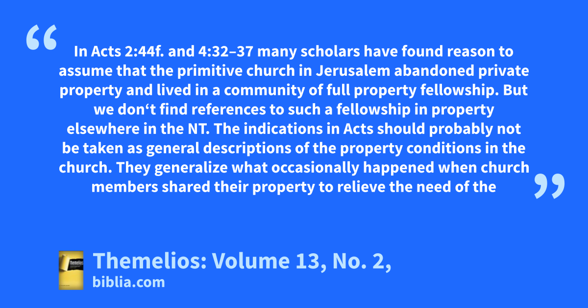 In Acts 2:44f. and 4:32–37 many scholars have found reason to assume that the primitive church in Jerusalem abandoned private property and lived in a community of full property fellowship. But we don‘t find references to such a fellowship in property elsewhere in the NT. The indications in Acts should probably not be taken as general descriptions of the property conditions in the church. They generalize what occasionally happened when church members shared their property to relieve the need of the