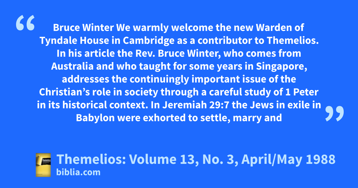 Bruce Winter We warmly welcome the new Warden of Tyndale House in Cambridge as a contributor to Themelios. In his article the Rev. Bruce Winter, who comes from Australia and who taught for some years in Singapore, addresses the continuingly important issue of the Christian’s role in society through a careful study of 1 Peter in its historical context. In Jeremiah 29:7 the Jews in exile in Babylon were exhorted to settle, marry and