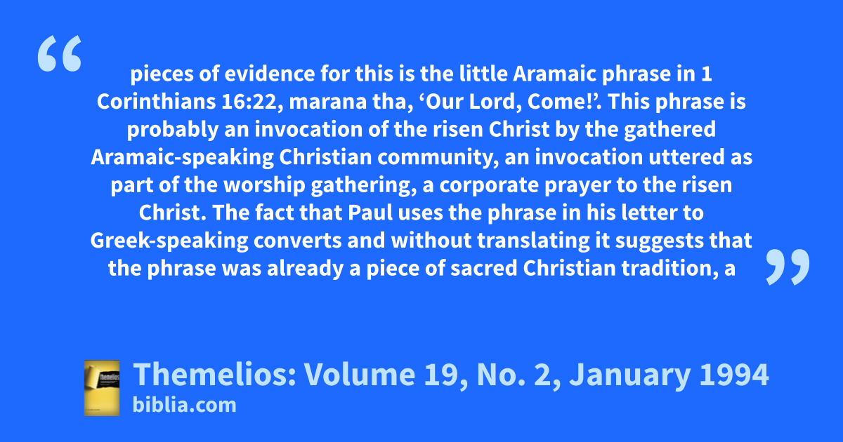 pieces of evidence for this is the little Aramaic phrase in 1 Corinthians 16:22, marana tha, ‘Our Lord, Come!’. This phrase is probably an invocation of the risen Christ by the gathered Aramaic-speaking Christian community, an invocation uttered as part of the worship gathering, a corporate prayer to the risen Christ. The fact that Paul uses the phrase in his letter to Greek-speaking converts and without translating it suggests that the phrase was already a piece of sacred Christian tradition, a